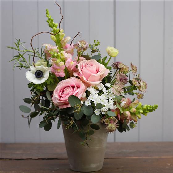 A beautiful selection of pink and white flowers expertly arranged in a heavy duty stone ware pot.
