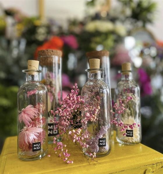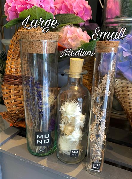 Beautiful dried flowers in a stylish glass bottle. The bottle is closed with a stopper. The perfect addition to your gift! Many colors available, which we choose randomly. Please select your size. £6 is the price of the smallest bottle.