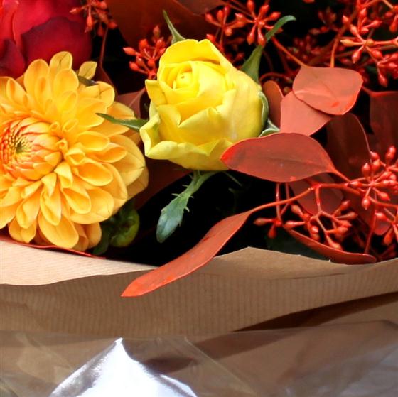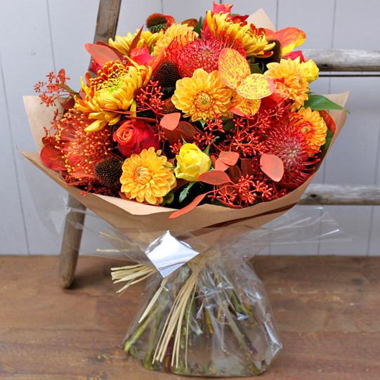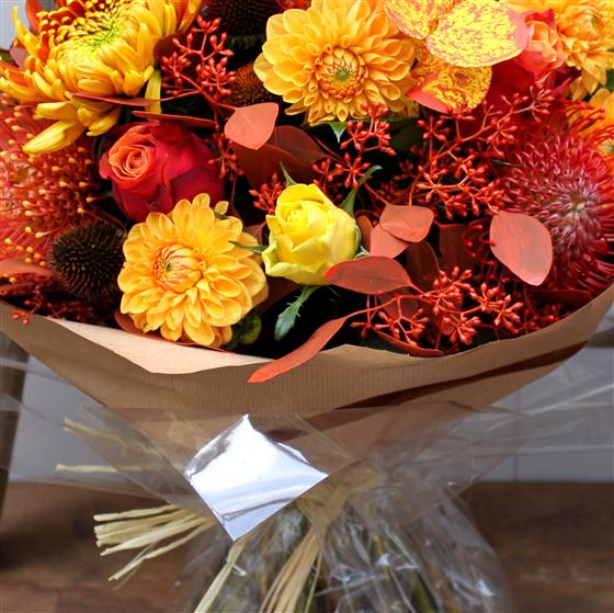A magnificent enchanting display of deep gold, red and orange blooms in an array of textures and shades. This bouquet captures the very essence of a bountiful autumn.