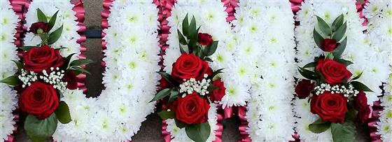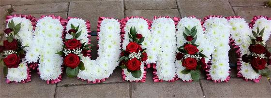 MUMMY floral letters shown in red and white, many colours available, contact us for more details. Price is for ribbon edging on letters, foliage edging is £60 per letter, total £240.