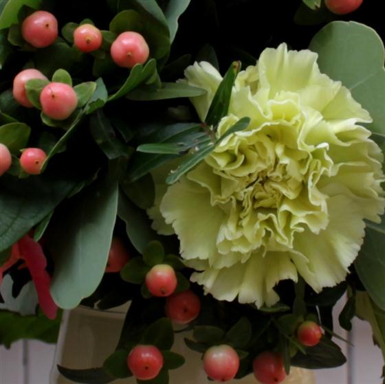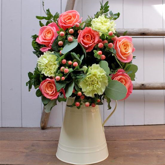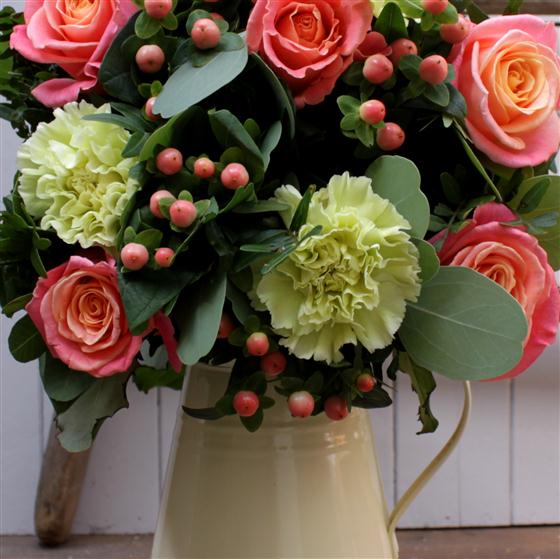 Half a dozen beautiful Miss Piggy roses, pastel green carnations, berries and seasonal foliage hand tied and presented in an enamel jug.