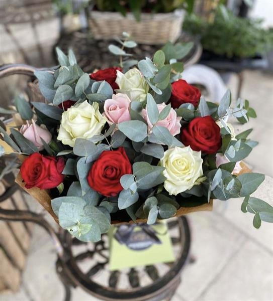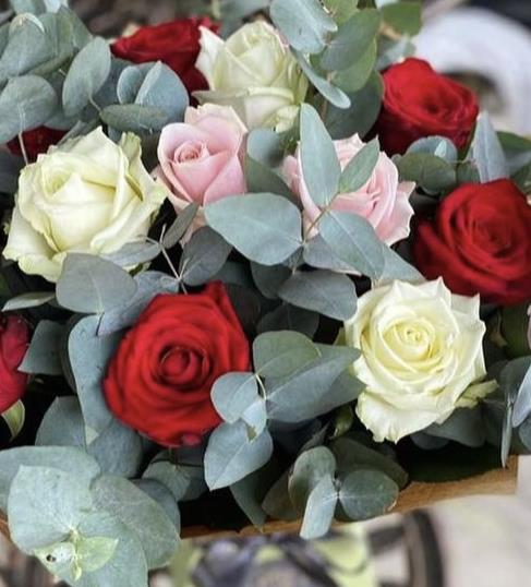 Beautiful bouquet made of roses and eucalyptus leaves. Roses are red and pastel. The dominant colors are delicate.