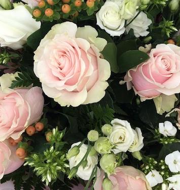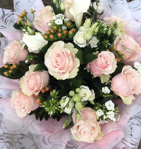 beautiful arrangement of soft blush roses with foliage and lisianthus and berry.