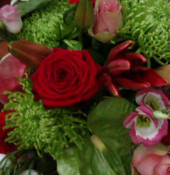 Rich ruby red highlighted with bright green and enhanced with pink shades. made with roses, lisianthus, anthurium, lilies and anastasia. Picture is of medium option