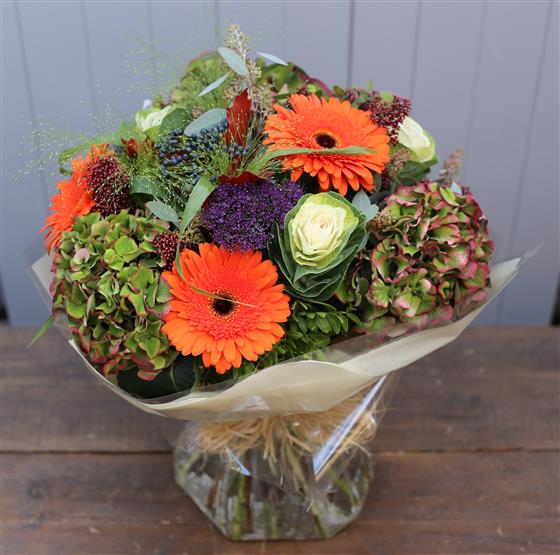 Large orange gerbera, brassica and seasonal hydrangeas accented with touches of purple trachelium and seasonal foliage.