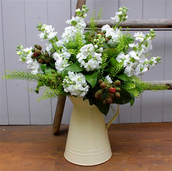 Beautifully scented stocks and seasonal foliage expertly arranged in an enamel jug.