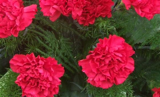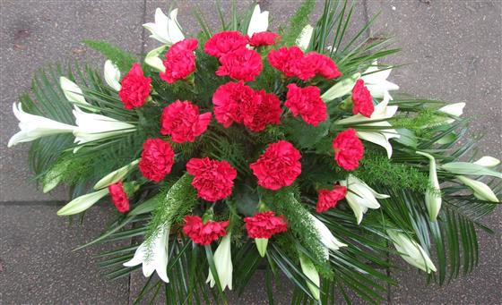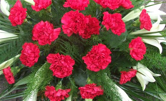 A very special tribute featuring a cluster of red carnations surrounded by sculptural lilies.