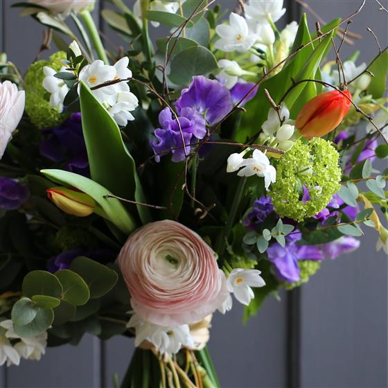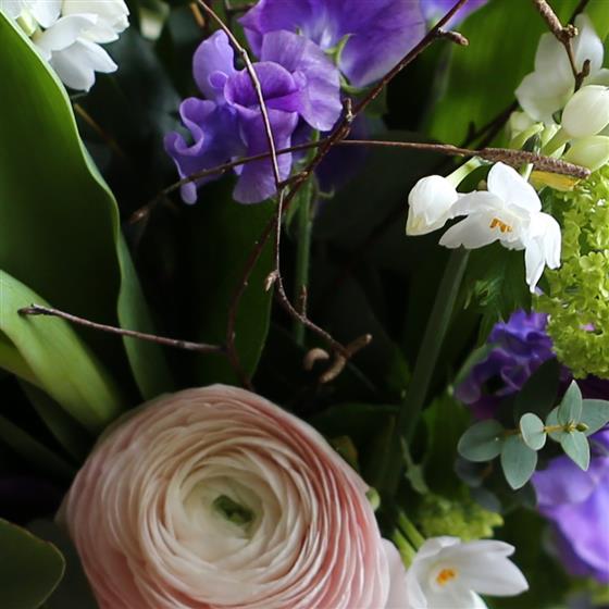 Scented Narcissus, ranunculus and seasonal fillers and foliage.