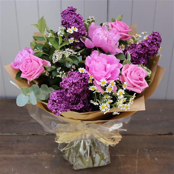 A summer hand tied of lilac, peonies, roses and feverfew.